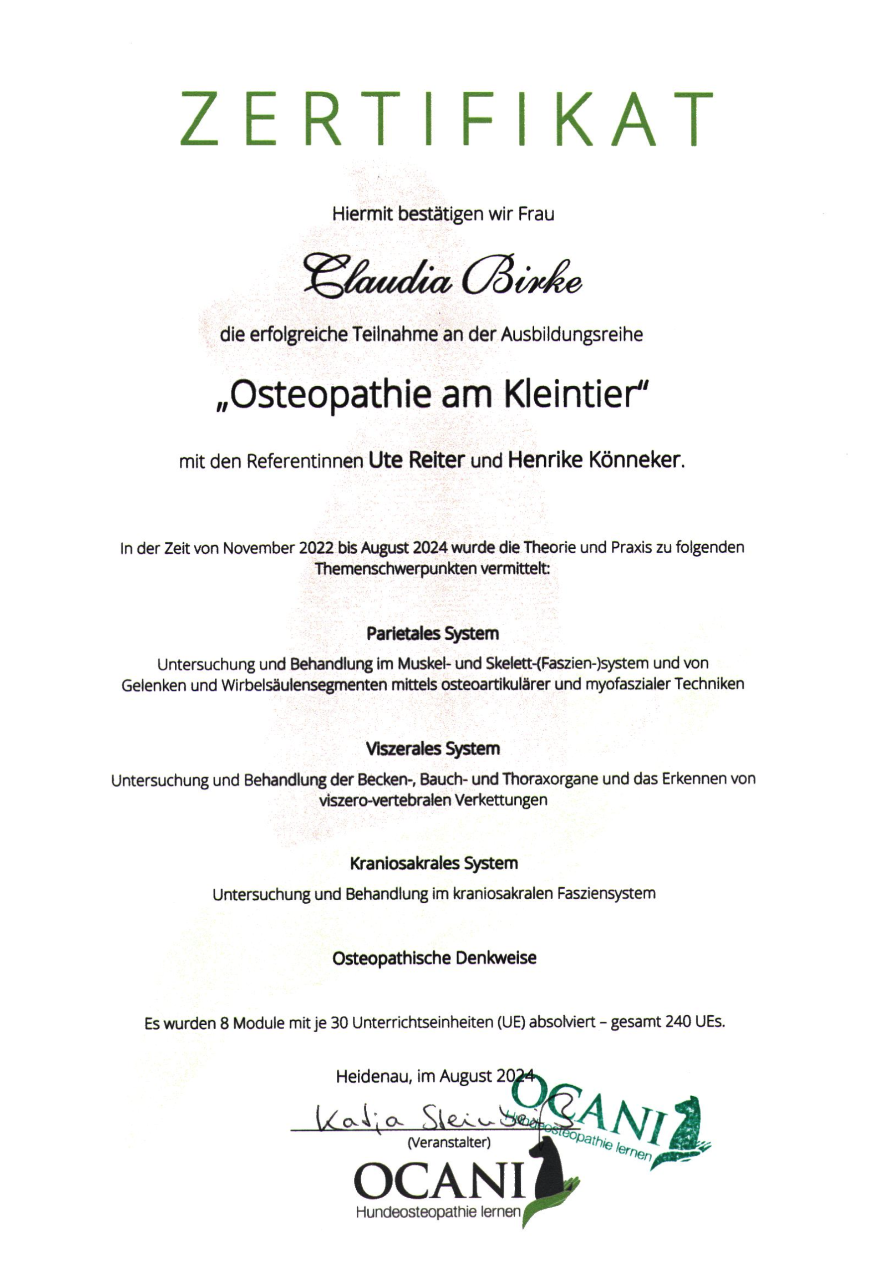 Für mich ist es selbstverständlich, mein Wissen rund um Tierphysio und Osteopathie stetig zu erweitern und zu überprüfen. Deshalb bilde ich mich regelmäßig weiter und sammle durch den Kontakt mit Dozenten und Kollegen weitere wertvolle Erfahrungen.
